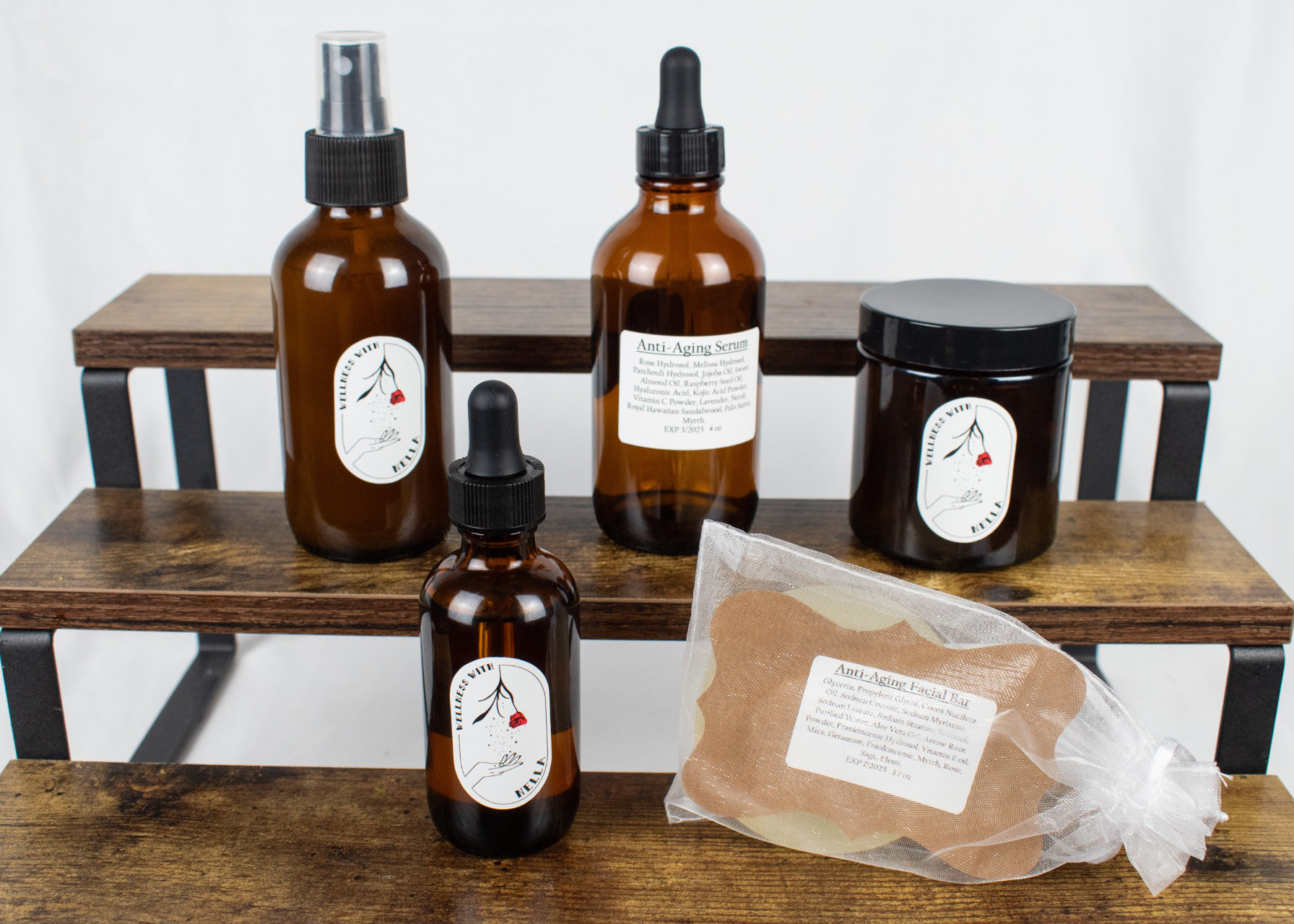 Rediscover youthful radiance with our Anti-Aging line. Formulated to soften fine lines, promote plumpness, and improve skin tone, this luxurious collection features potent essential oils like Frankincense, Myrrh, Rose, Blue Tansy, Neroli, and Melissa.