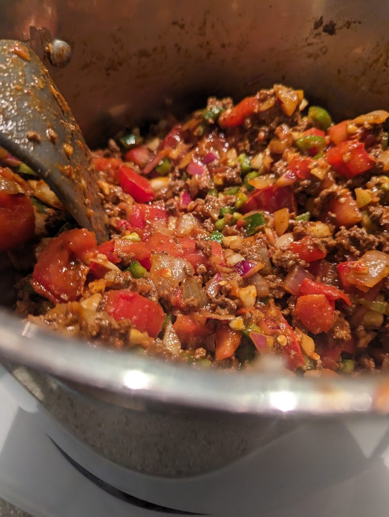 - Add in spices and give it a good mix. Be sure all onions and meat are coated with the spices. Let cook for 1-2 minutes. This helps deepen the flavor of the spices.