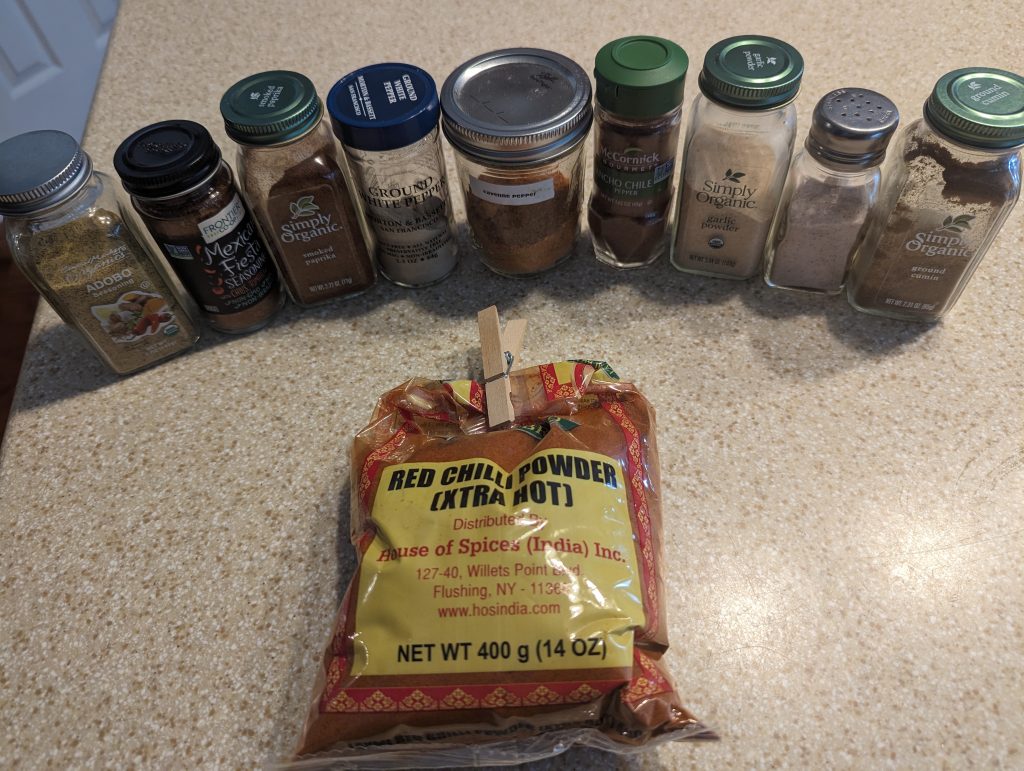 - Taste it! Time to see what flavors you want to add or balance. My usual process at this point is to adjust the salt, chili powder, garlic powder, cayenne ,white pepper, ancho chili and extra hot chili powder. I do the same dump, eye it and taste method.