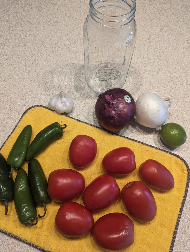 I chop the garlic, tomato, jalapeno, red onion and place it into the 64 oz Mason Jar. Once all chopped and pressed in squeeze the juice of half a lime. Then put the lid on and give it all a good shake. The acids of the ingredients will start to break the produce down and start melding the flavors together.